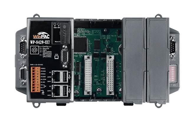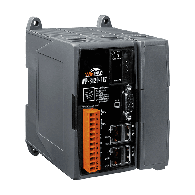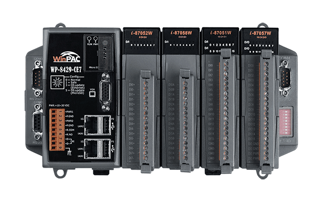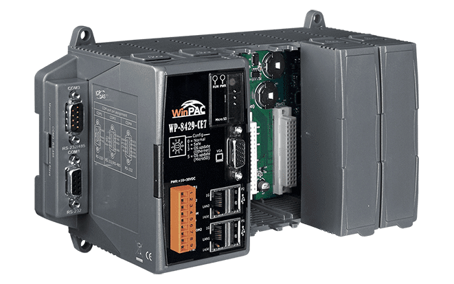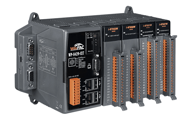 InduSoft (1500 tags) Based WinPAC Controller with Cortex-A8 1GHz, 512MB DDR3, 256MB Flash, 2 x Ethernet, 1 x RS-232, 1 x RS-485, 4 I/O Expansion Slots, Windows CE 7.0 Professional, Hard Real-Time, Redundant Power Input, Operating Temp up to 75 °C.