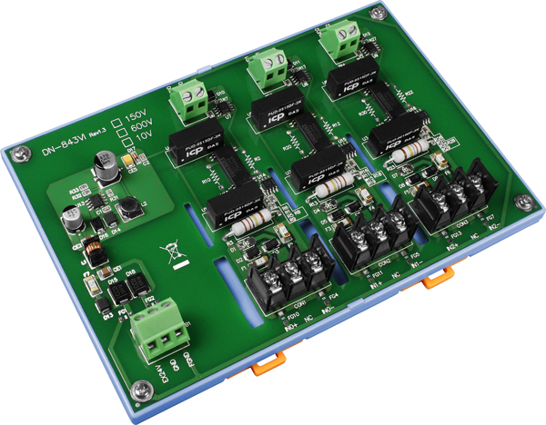 The DN-800V series are voltage input attenuator. The maximum input range is from ±80 V to +/- 600 V and can be attenuated to ±10 V. The "I" version provide 3000VDC intra-modules isolation and 3000VDC channel to channel isolation to avoid the noise interference from inputs to outputs or channel to channel. It can be used with the analog input modules such as I-7017 and I-87017 etc. to measure the high voltage.