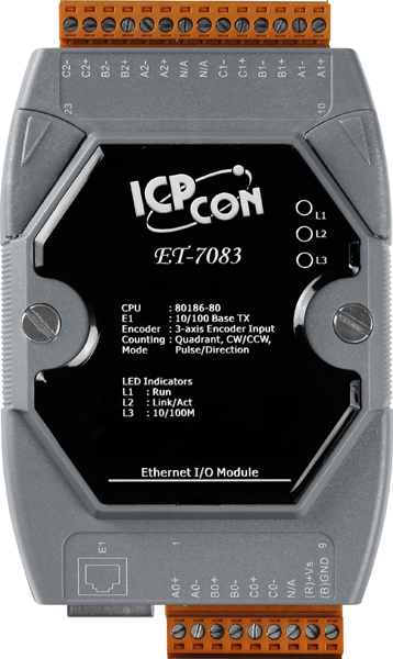 The ET-7083/PET-7083/ET-7283/PET-7283 is a 3-axis high speed encoder/counter module. Its each axis can be individually configured for Quadrant, Pulse/Direction or CW/CCW counting modes. The maximum input rate for Quadrant counting mode is 1 MHz, and for Pulse/Direction, CW/CCW counting modes is 4 MHz. The encoder/counter module is equipped a FRAM to retain the counter value after it is powered off. FRAM is a nonvolatile memory that can hold written data even after it is powered off. The data retention can be 10 years. And the feature can be configured as enabled or disabled.