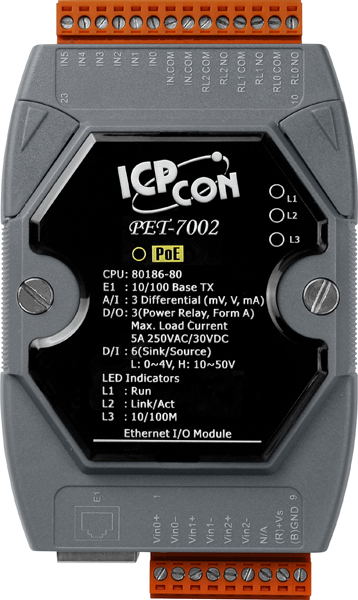 The PET-7002 is a multi-function module provides 3 analog input channels, 6 digital input channels and 3 relay output channels. A programmable input range is provided on all analog inputs (+/- 150 mV, +/-500 mV, +/-1 V, +/-5 V, +/-10 V, +/-20 mA, 0~20 mA and 4~20 mA). The range for each analog input can be configured individually and each input has a high overvoltage protection of 240Vrms. The analog inputs are also jumper selectable for either voltage or current inputs. The PET-7002 is fully RoHS-compliant and provides 4 kV ESD protection, 3 kV surge protection as well as 2500 VDC intra-module isolation.